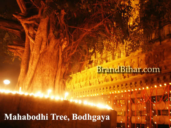 The present Bodhi Tree is probably the fifth succession of the original tree under which the Buddha had attained enlightenment. The tree is located behind the temple and is about 80 feet high and about 115 years old. Vajrasana, the seat of stability, is a stone platform on which the Buddha is supposed to have sat in meditation gazing east, under the Bodhi tree. A sapling of the original bodhi tree that the Buddha sat under was carried by Emperor Ashoka's daughter (Sanghamitta) to Sri Lanka. That tree is at Anuradhapura in Sri Lanka. A cutting from that tree was planted in Budha Gaya when the original tree died. Under the tree is a red sandstone slab that is said to be the Vajrasana, the diamond throne, that Buddha sat on and attained nirvana.
